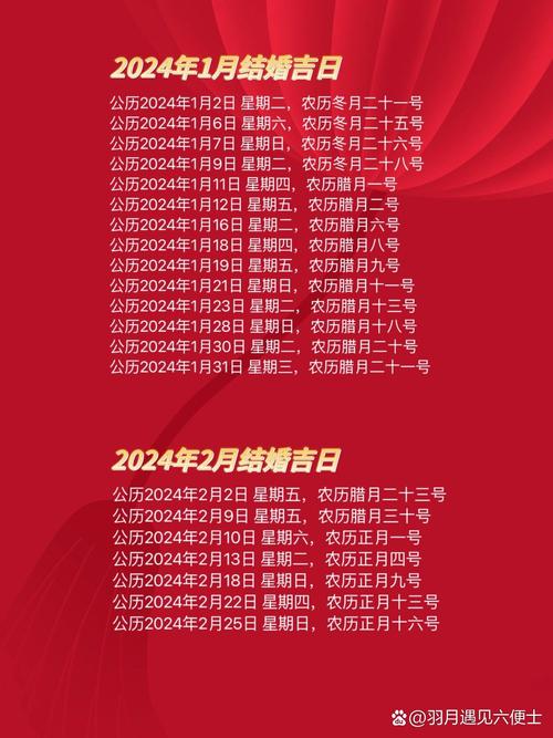 二月份結(jié)婚的黃道吉日有很多,選擇合適的吉日可以確?;槎Y順利并帶來好運(yùn)。以下是2024年2月適合結(jié)婚的吉日列表及相關(guān)注意事項(xiàng)。