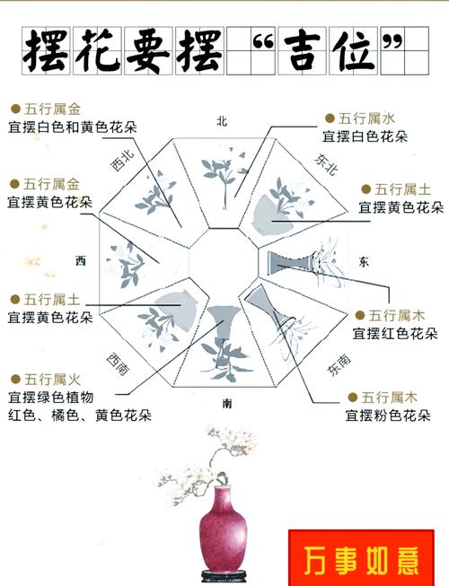 在風(fēng)水學(xué)中,花的擺放位置與五行有著密切的關(guān)系。以下是一些常見的方位與五行、花卉顏色的對(duì)應(yīng)關(guān)系: