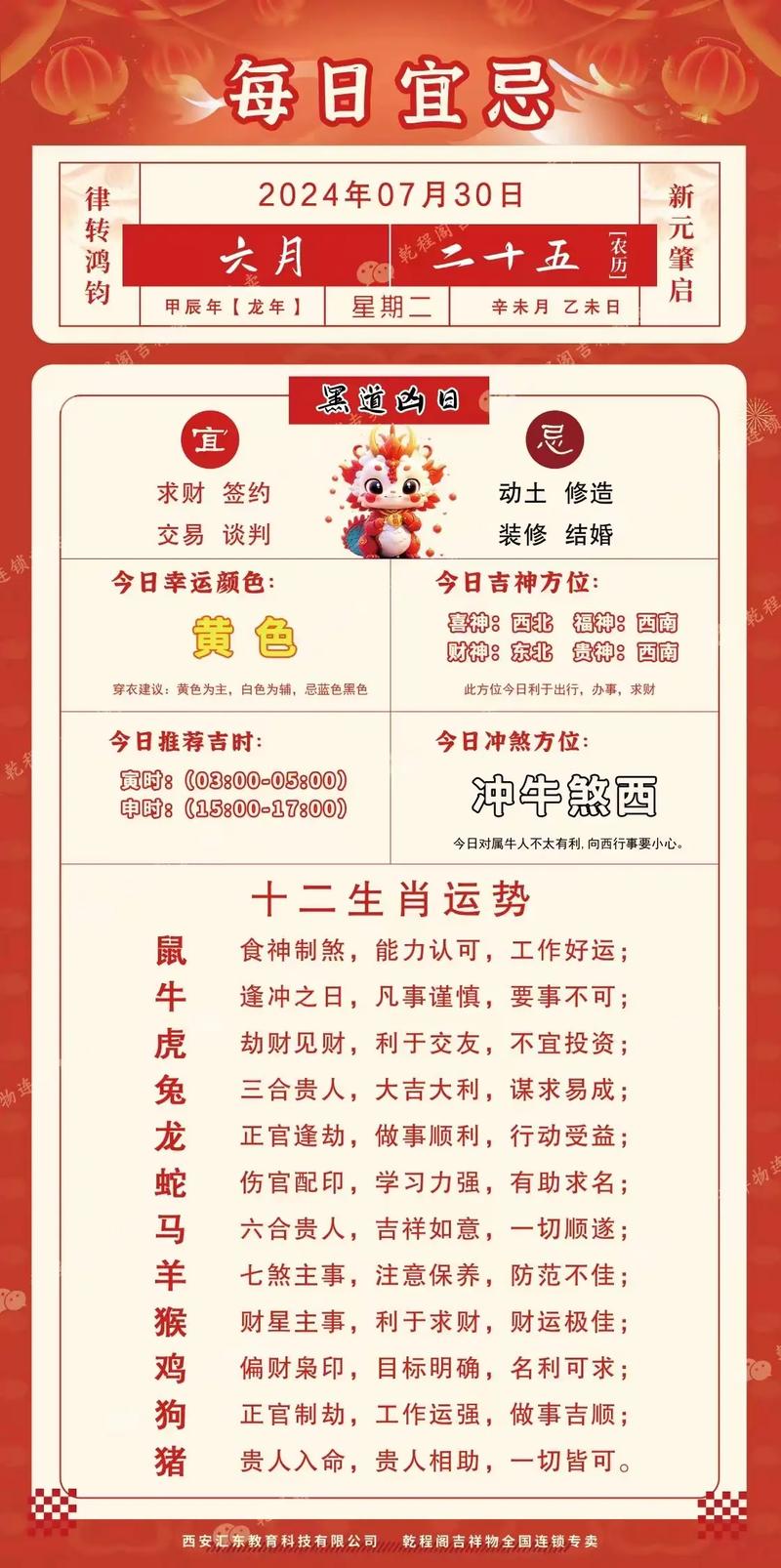 根據(jù)五行穿衣指南,2024年8月1日的吉色是黑色、藍色,次吉色是白色、銀色,招財色是紅色、粉色,消耗色是黃色、咖啡色,不利色是綠色、青色。選擇合適的穿衣顏色,可以增強個人的運勢,特別是在求財活動中,選擇招財色可能更有助于成功。