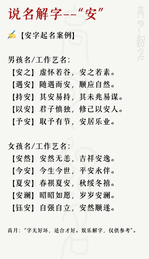 這種寓意不僅表達了對孩子健康成長的祝愿,更寄托了對孩子未來人生道路的美好期盼。平安吉祥是人們普遍追求的生活狀態(tài),安字能夠很好地傳達這種美好的愿望。
