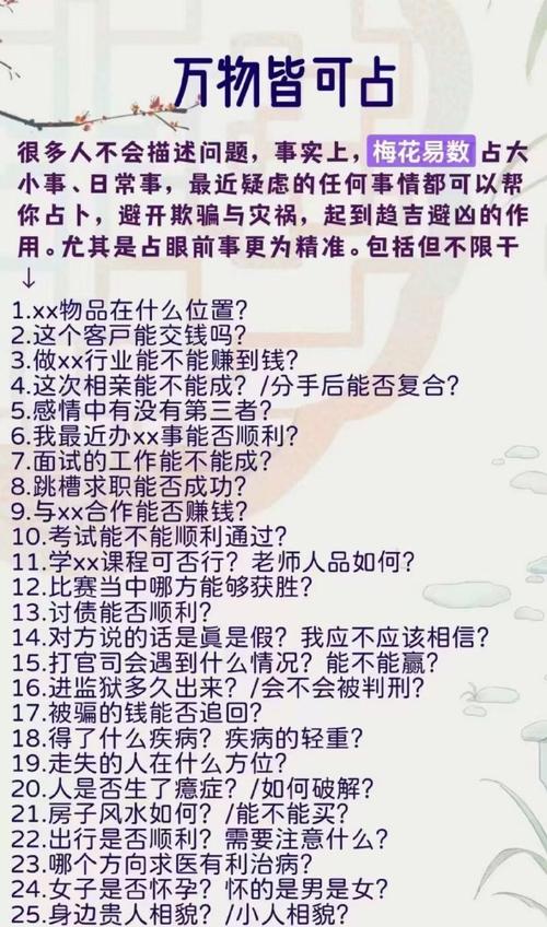 在提出這些問題時(shí),務(wù)必要清晰具體,避免模棱兩可的措辭。此外,保持開放的心態(tài)也很重要,因?yàn)樗忝鼛熆赡軙?huì)提供您意外或挑戰(zhàn)性的見解。切記,算命只是提供指導(dǎo),而不是預(yù)測(cè),最終決定權(quán)仍掌握在自己手中。