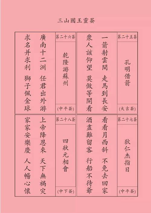 三山國王靈簽是一種傳統(tǒng)的占卜方式,其簽文通常包含對(duì)未來、命運(yùn)、事業(yè)、愛情等方面的指導(dǎo)。以下是對(duì)部分簽文的解釋: