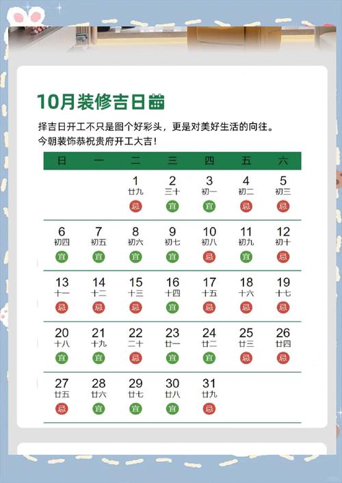 選擇裝修黃道吉日是許多家庭在裝修前會(huì)考慮的重要事項(xiàng),尤其是在中國(guó)傳統(tǒng)風(fēng)水文化中。2024年10月的裝修黃道吉日有哪些?以下是詳細(xì)的查詢和分析。