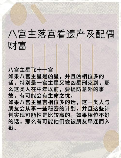 財(cái)富和資源:八宮宮主星代表配偶的財(cái)富和資源,如遺產(chǎn)、保險(xiǎn)等。