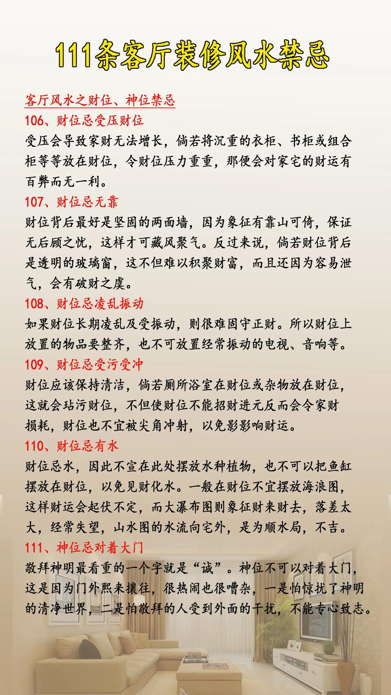 8. 禁忌:避免客廳陰暗、地板高低不平、成為動(dòng)線、有橫梁壓頂、亂掛猛獸丹青等。這些布局容易導(dǎo)致氣流不暢,影響居住者的運(yùn)勢(shì)和健康。