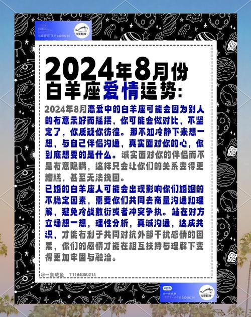 白羊座在2024年8月底的整體運勢涉及事業(yè)、感情、財運和健康等多個方面。以下是對這些方面的詳細(xì)分析。