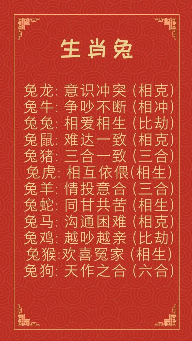 1. 狗: 屬狗人忠誠可靠,他們能提供屬兔人所需的穩(wěn)定和安全感,而屬兔人則能為屬狗人帶來歡樂和活力。這兩個生肖的結(jié)合,可以創(chuàng)造出和諧、持久的婚姻。