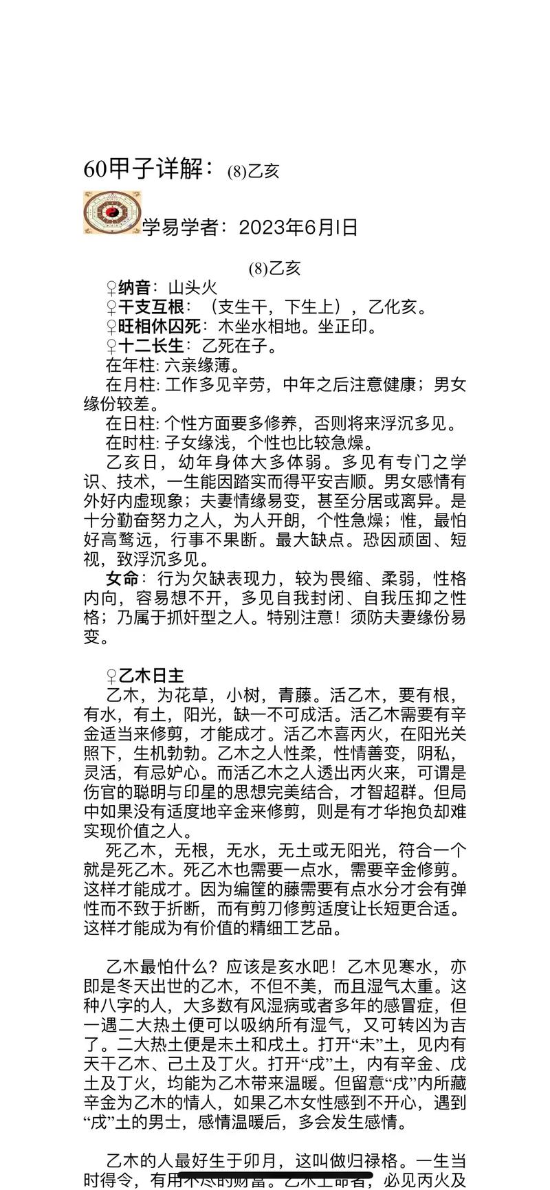 乙亥日柱的八字算命涉及多個(gè)方面,包括性格特點(diǎn)、職業(yè)和事業(yè)、感情和婚姻以及健康狀況。以下是對(duì)這些方面的詳細(xì)分析。