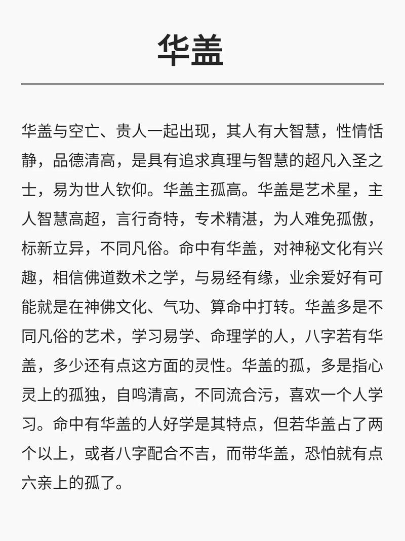 華蓋星并非傳統(tǒng)命理學(xué)中的十神,而是屬于神煞范疇。其含義較為復(fù)雜,既有貴氣、清貴的寓意,也有孤寂、出世的傾向。一般認(rèn)為,華蓋星入命者,智商較高,思維敏捷,具有藝術(shù)天賦,但為人清高淡泊,不喜世俗煩擾。