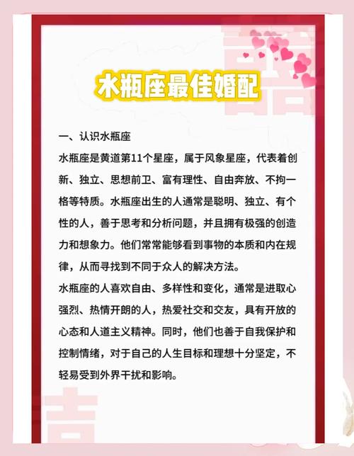 水瓶座的最佳生辰八字婚姻涉及到星座、命理、性格等多個方面。為了更好地理解水瓶座的婚姻特點,我們可以從星座特性、最佳婚配星座、婚姻運勢和成功秘訣等方面進行探討。