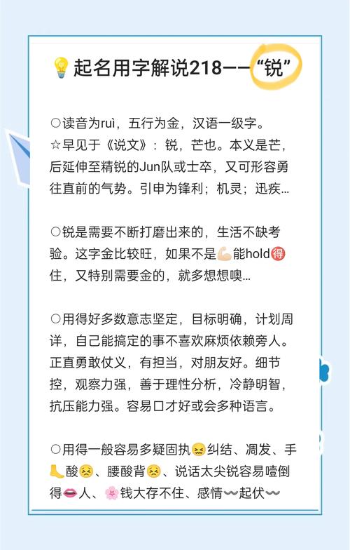銳字在取名中既有積極的一面,也有不利的方面。其五行屬金,適合五行缺水的人取名,但不宜與五行屬木和火的人搭配。取名時要避免與屬兔和屬猴的人相沖的字,以及生僻字和韻母相同的字。結(jié)合個人情況和八字,選擇合適的字進(jìn)行搭配,可以取到一個吉祥如意的名字。