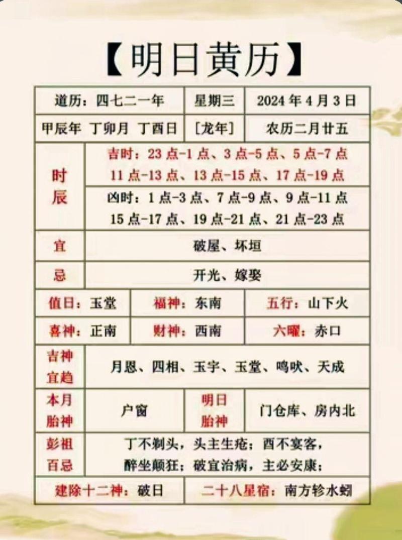 在農(nóng)歷中,吉日不僅能帶來(lái)好運(yùn),還能避免厄運(yùn)。了解明天的吉日,仔細(xì)規(guī)劃行程,不僅能給生活帶來(lái)和平與安寧,還能給未來(lái)帶來(lái)機(jī)遇和成功。