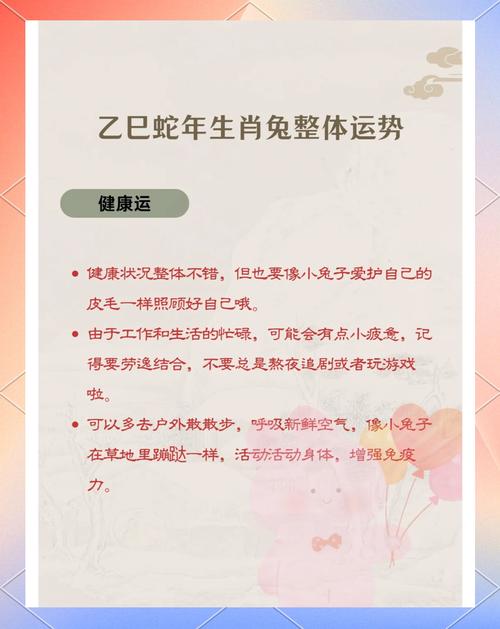 屬兔的朋友們,你們的健康運勢一般都不錯。但是,也要注意飲食和作息,不要熬夜,不要吃太油膩的食物。