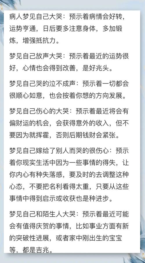 別人在夢中哭泣,往往會引起不同的情緒反應(yīng)。周公對別人哭泣有很多解釋,包括情感、人際關(guān)系和預(yù)示好壞。