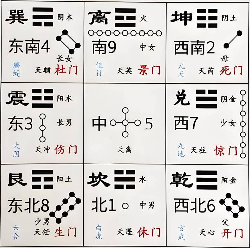 奇門遁甲中,八門分別是開、休、生、傷、杜、景、死、驚。它們分別代表著不同的方向、時間和好運。