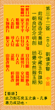 觀音靈簽32的簽名是:“劉皇叔求賢,折簡訪三英。孔明出山,蜀漢定乾坤?!?/p>