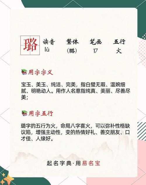在起名時,需要結合寶寶的生辰八字,分析其五行屬性,選擇與“璐”字五行相生的字,以達到五行平衡,從而對寶寶的運勢起到積極作用。例如,如果寶寶五行缺水,可以選擇帶有“水”字旁的字,如:璐涵、璐清等。
