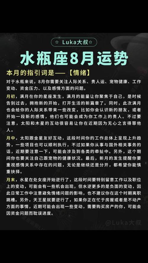 財(cái)運(yùn)方面,水瓶座八月應(yīng)謹(jǐn)慎理財(cái)。月初有意外收入的機(jī)會(huì),但中旬可能遇到意外支出。下旬,投資運(yùn)勢(shì)回升,但仍需謹(jǐn)慎決策。