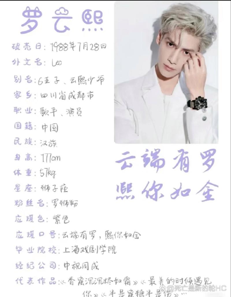 羅云熙,1988年7月19日出生于四川省成都市,中國內(nèi)地男演員、歌手。畢業(yè)于上海戲劇學院舞蹈學院。2010年,參加東方衛(wèi)視選秀娛樂節(jié)目《加油!東方天使》獲得總冠軍,從而正式進入娛樂圈。2013年,憑借青春偶像劇《夏日戀歌》嶄露頭角。2015年,憑借古裝仙俠劇《花千骨》中的“殺阡陌”一角獲得廣泛關注。2018年,憑借古裝劇《香蜜沉沉燼如霜》中的“潤玉”一角爆紅。