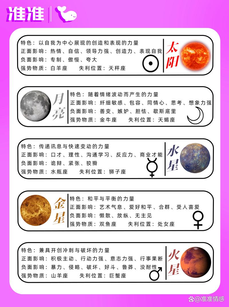 每顆行星在占星學(xué)中都有其特定的象征意義和影響力。比如,木星被認為是幸運和繁榮的象征,它的影響力通常帶來好運和擴展機會。而土星則代表挑戰(zhàn)與限制,其影響力可能導(dǎo)致阻礙和困難。了解這些行星的特性有助于我們把握生活中的吉兇時機,從而作出有利的決策。
