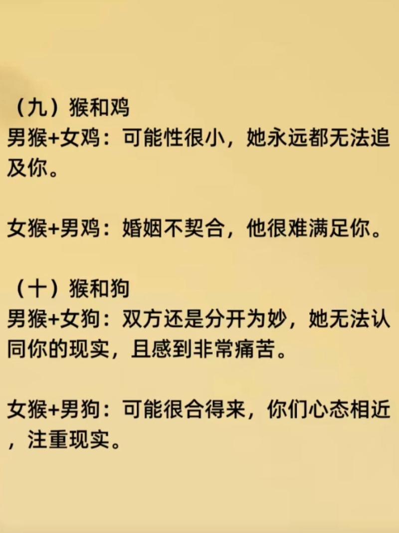 猴女活潑開朗,雞男勤奮上進,兩人相敬如賓,舉案齊眉。猴女能理解雞男的事業(yè)追求,雞男也能包容猴女的古靈精怪。這樣的婚姻,是彼此成就,共同成長的典范。