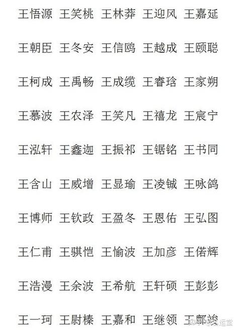 女孩: 可選用寓意著美麗、溫柔、聰慧、賢淑的字,如“婉”、“靜”、“雅”、“馨”等。例如:王婉婷、王靜怡、王雅馨。