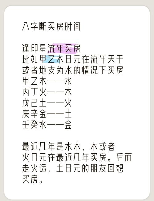 房屋朝向的五行也會對居住者的運(yùn)勢產(chǎn)生影響,在擇吉時,也應(yīng)結(jié)合房屋的朝向五行進(jìn)行綜合考慮。如,坐北朝南的房子,五行屬火,宜選五行屬金或?qū)偎稳兆尤胱 ?/p>