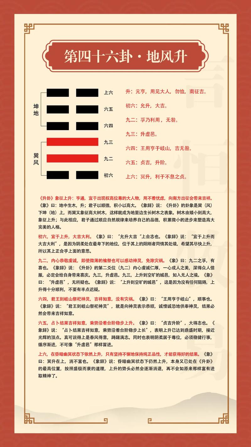 地風升卦,顧名思義,就是大地之風,帶著生機與希望,向上升騰。這個卦象預示著你要走大運啦!