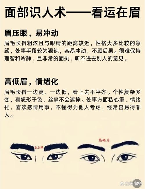 濃眉大眼者,威嚴(yán)氣度,事業(yè)有成。眉尾上揚(yáng),志向遠(yuǎn)大;眉尾下垂,缺乏決斷力。眉骨高凸,做事果斷,領(lǐng)導(dǎo)能力強(qiáng)。