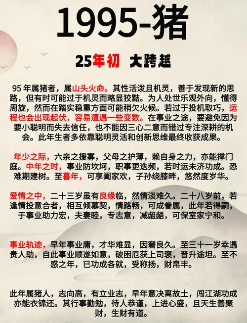 1995年出生的人,作為乙亥年的人,承載著木與水的雙重特性,他們的命運(yùn)充滿(mǎn)了可能性與挑戰(zhàn)。在面臨生活中的種種選擇時(shí),記住自己的根本特性,善用自己的創(chuàng)造力與適應(yīng)能力,將是他們走向未來(lái)的關(guān)鍵。