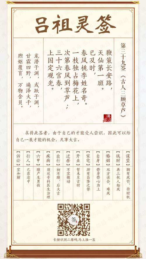 呂祖靈簽39求子,簽文云:“子息綿綿福祿長(zhǎng),家門(mén)和睦喜氣揚(yáng)。貴人引路逢佳兆,得子添丁福壽康?!贝撕炆仙?,寓意求子者必得貴人相助,多子多福,家門(mén)和睦。