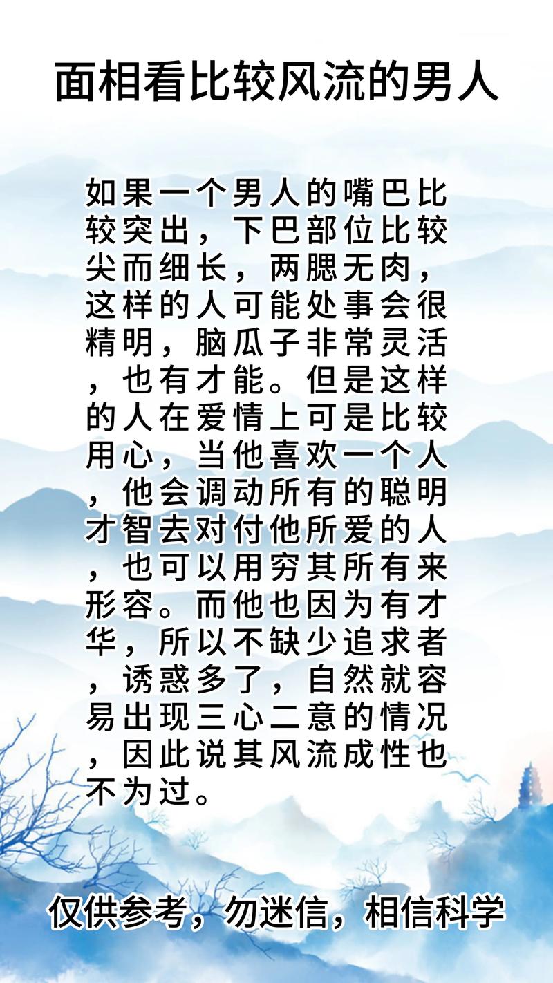 面相學(xué)僅供參考,并非絕對準(zhǔn)確。一個(gè)人是否風(fēng)流成性,受多種因素影響,包括其家庭環(huán)境、教育程度、性格特質(zhì)等。