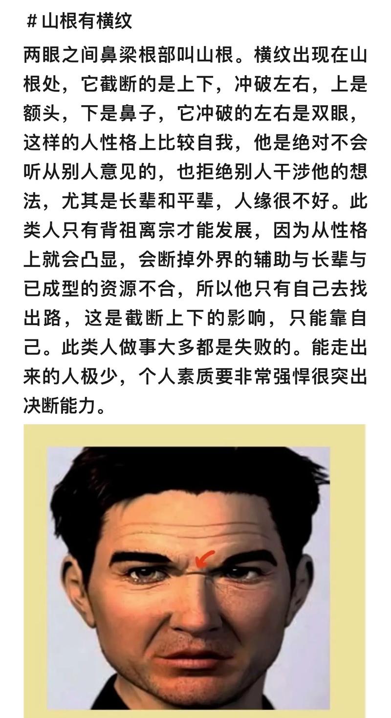 面相學(xué)中,山根是鼻梁根部連接兩眉頭處。山根有橫紋,代表著不同的運(yùn)勢(shì)和性格特點(diǎn)。