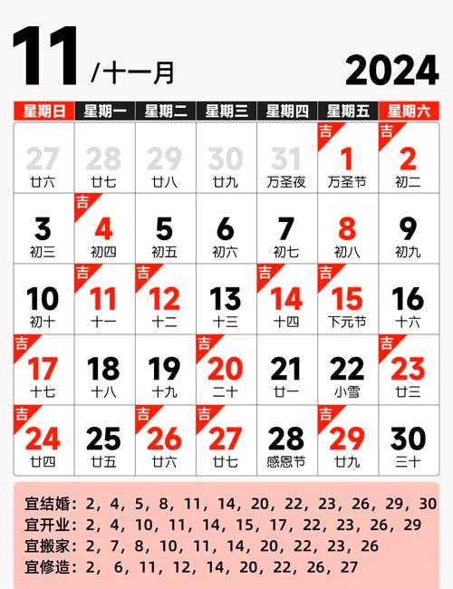 2015年11月可謂吉日連連,良辰美景不勝枚舉。從月初的庚子日到月末的己亥日,共有12個(gè)日子宜嫁娶、開業(yè)、動(dòng)土等喜慶事宜。其中,尤以11月8日和11月19日最為適宜,最適合舉行婚禮、喬遷新居等人生大事。