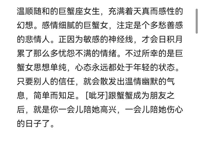 巨蟹座的女生以她們細(xì)膩的情感和豐富的內(nèi)心世界而著稱(chēng)。她們的傾訴,仿佛是一條奔騰的河流,流淌著她們的喜怒哀樂(lè),酸甜苦辣。