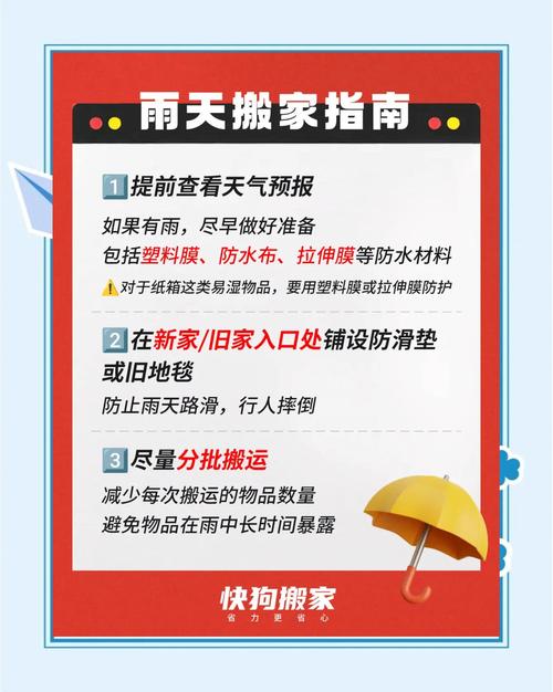 1. 擇吉時(shí)搬遷: 如遇吉日下雨,可選擇雨?;蛴陝?shì)較小時(shí)搬遷,避開雨水較大的時(shí)段。