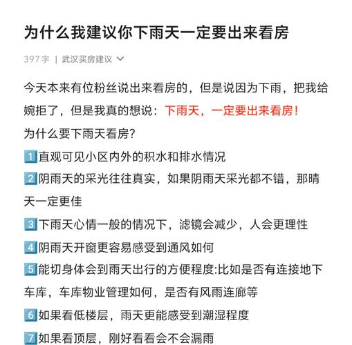 雨天看房也并非一無(wú)是處。雨水可以沖刷掉表面的灰塵,讓房子的廬山真面目更加清晰。而且,雨天看房的人少,買家可以更從容地挑選自己喜歡的房子。