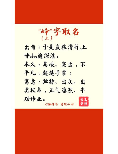 “崢”字,字形上由“山”和“爭(zhēng)”組成,寓意為山峰崢嶸,突出,有奮力向上,不甘平庸之意。用于人名,尤其適合陽(yáng)剛之氣的男孩,象征其具有堅(jiān)韌不拔、積極進(jìn)取的精神。結(jié)合虎寶寶的生肖特點(diǎn),更能凸顯其勇猛果敢,追求卓越的個(gè)性。