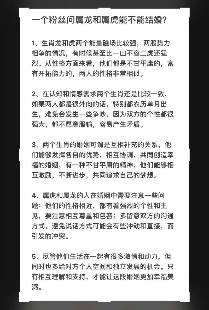 屬龍和屬虎相克嗎?答案是肯,但并不是絕對(duì)的。只要雙方都能包容對(duì)方,互相理解,就能化解相克之勢(shì),過(guò)上幸福美滿的生活。