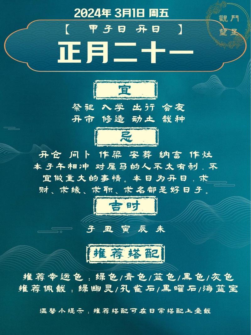 2. 宜出行吉時:早上7-9點、中午11-1點、下午3-5點