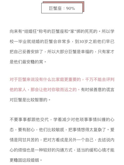 家庭觀念:家庭對于巨蟹座男性來說至關(guān)重要。他們希望找到一個能夠為他們提供穩(wěn)定和情感支持的伴侶。因此,他們往往會在成熟并對自己的職業(yè)道路有信心時才考慮結(jié)婚。