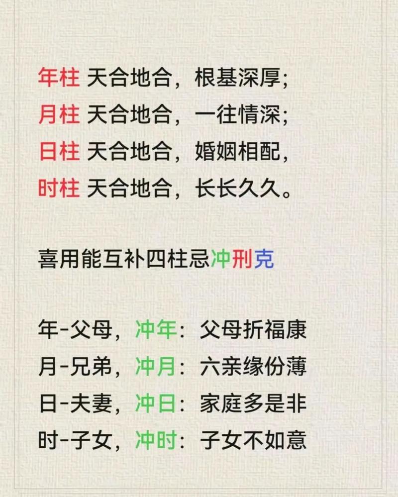 3. 日柱的匹配:日柱代表個人的運勢和性格,如果兩人的日柱相合,通常意味著他們在個性和命運上有較好的契合度。