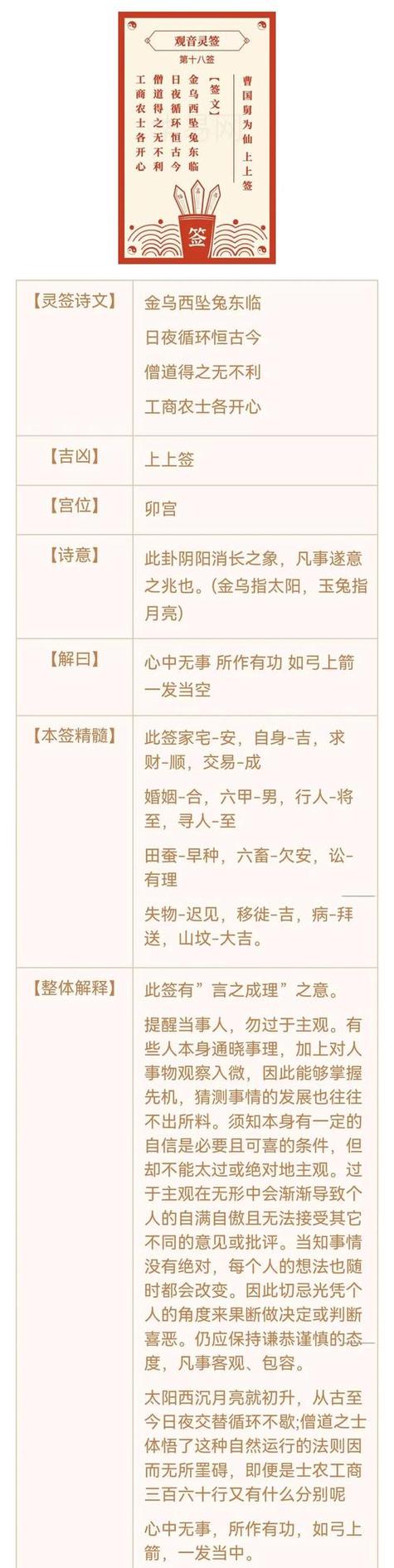 觀音靈簽49簽詳解、白話、守舊吉祥、姻緣上乘、事業(yè)甚吉、學業(yè)尚可、求財一般、健康尚可、出行一般。