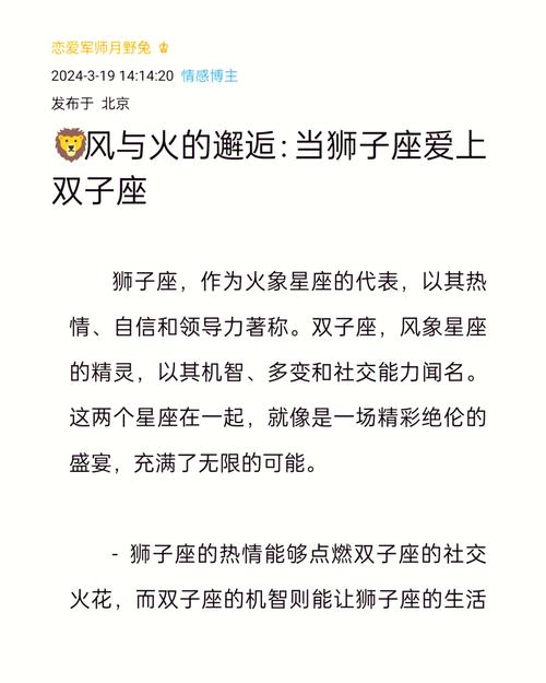 獅子座是火象星座,充滿自信、熱情和領(lǐng)導(dǎo)能力。他們熱愛聚光燈,渴望得到認(rèn)可和贊賞。相反,雙子座是風(fēng)象星座,聰明、足智多謀、善于溝通。他們思維敏捷,總能找到新的信息和體驗(yàn)。