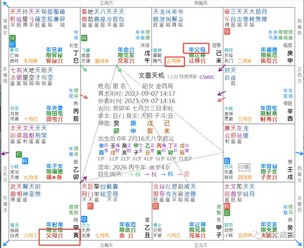 2. 大限三方四正: 三方指的是大限命宮的財(cái)帛宮、官祿宮、遷移宮,四正則是加上大限命宮本身。這四個(gè)宮位相互影響,構(gòu)成了大限運(yùn)勢(shì)的主要框架。需要分析這些宮位內(nèi)的星曜組合,以及它們與大限命宮的關(guān)系,從而了解事業(yè)、財(cái)運(yùn)、感情等方面的運(yùn)勢(shì)。