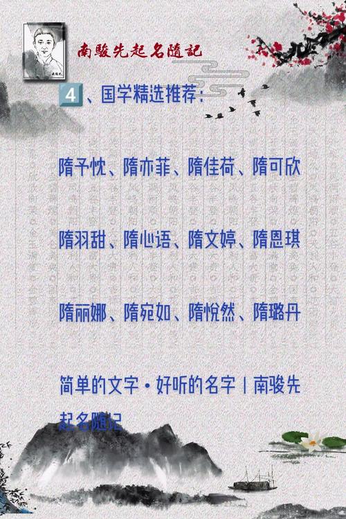 隋姓,一個(gè)蘊(yùn)含歷史底蘊(yùn)的姓氏,源于西周時(shí)期,寓意著跟隨、順應(yīng)。為隋姓男寶寶起名,既要體現(xiàn)其陽(yáng)剛之氣,又要展現(xiàn)其文化內(nèi)涵,更要順應(yīng)時(shí)代的潮流。以下提供一份專(zhuān)業(yè)精準(zhǔn)的隋姓男寶寶起名大全,并附有詳細(xì)解釋和建議,希望能幫助您為寶寶找到一個(gè)好名字。