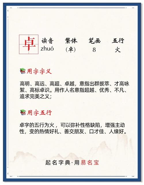 在姓名學中,“卓”字五行屬火,主禮,性格熱情開朗,積極向上,具有領(lǐng)導(dǎo)才能。 但也需要注意五行搭配,避免火過旺,影響性格平和。