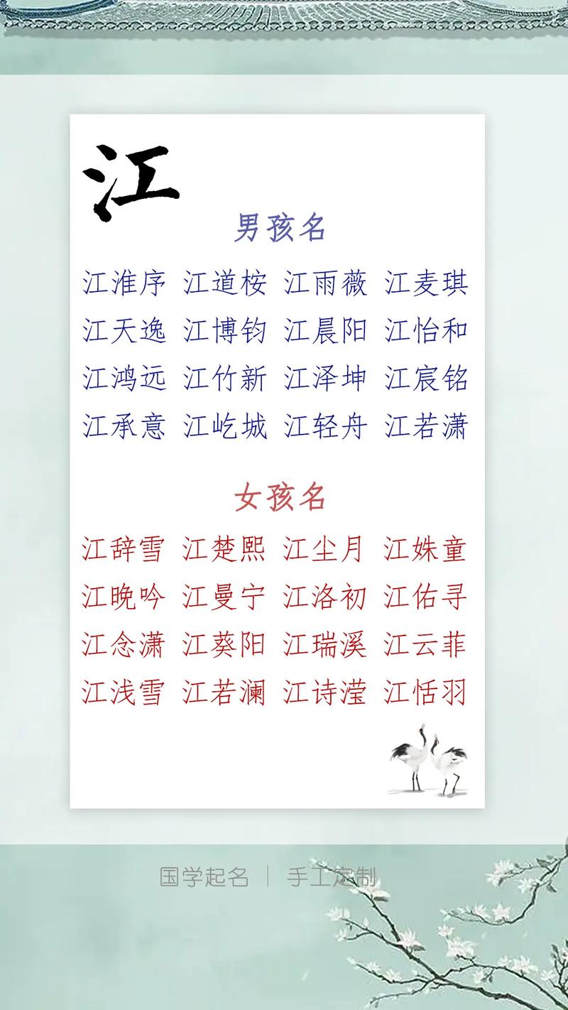 江: 代表江河、江水,象征著廣闊、奔騰、源遠(yuǎn)流長。常用來形容人的胸襟開闊,氣度不凡,也寓意著孩子能夠勇往直前,擁有廣闊的人生舞臺。這個字本身就具有很強(qiáng)的意象,給人以大氣、穩(wěn)重之感。