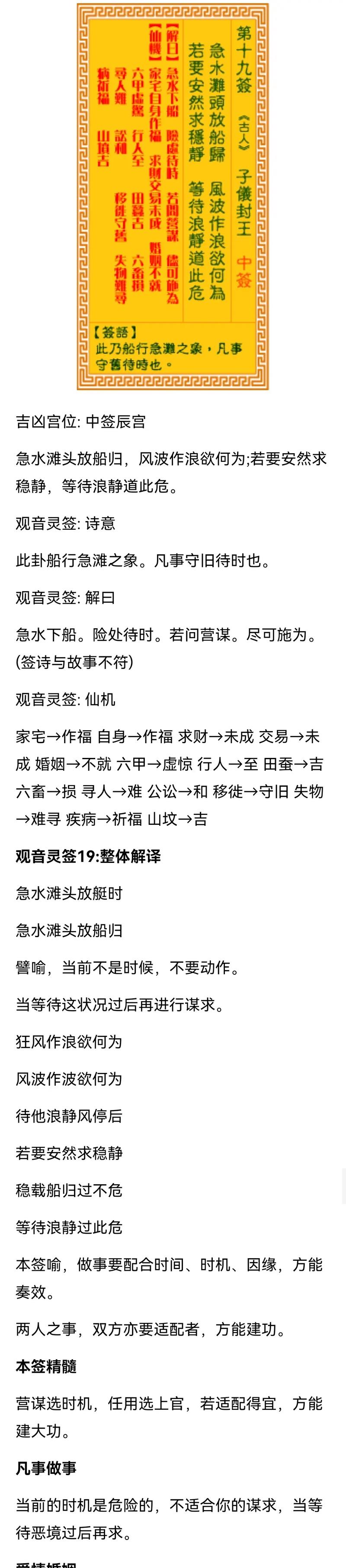 觀音靈簽19家宅,簽文為:“家宅興旺,安居樂(lè)業(yè),六畜興旺,財(cái)源廣進(jìn),子孫賢孝,福祿壽全。”此簽?zāi)松霞?,預(yù)示著家宅安寧,幸福美滿(mǎn),事業(yè)順利,財(cái)運(yùn)亨通,子孫賢孝,福祿壽全。