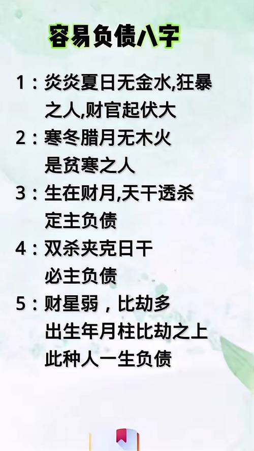 男人負債的八字命運,多半是這五種情況,財星弱、官殺旺、比肩劫財多、印星受損、八字相沖。如果你的八字中有這些情況,就要小心了,要努力改變自己的運勢,才能擺脫負債的困境。